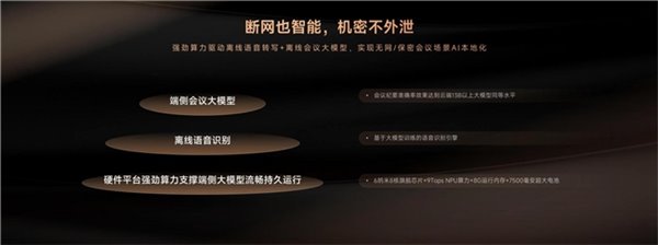 端侧大模型,树立数据安全新标杆:针对用户对信息安全与网络依赖的核心关切,X5 创新性采用端侧大模型技术路径,成为率先实现离线会议大模型部署的柔彩屏办公本。无网络环境下,仍可独立完成高质量语音识别、转写与纪要生成,适配无网会议、保密会议等特殊场景;同时构建“存储-阅读-访问”三重加密屏障,搭配指纹解锁实现专属访问权限,从根源杜绝数据泄露风险。硬件上,6 纳米 8 核旗舰芯片提供 9Tops AI 算力,配合 7500 毫安电池,保障端侧大模型流畅持久运行。